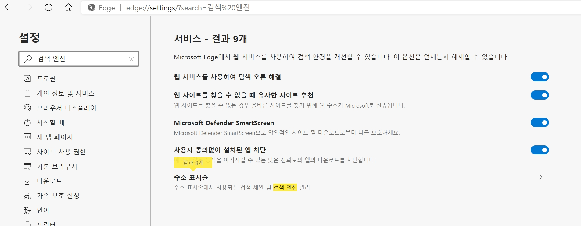 설정 화면에서 "검색 엔진" 으로 검색 해서 들어 가도 되지만 "검색" 으로만 검색 해서는 많은 내용이 나오며 이게 이건지 잘 모르겠다.