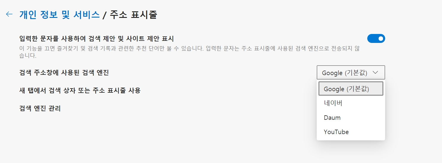 "주소표시줄" 설정으로 들어가면 이제서야 바꿀 수 있다.