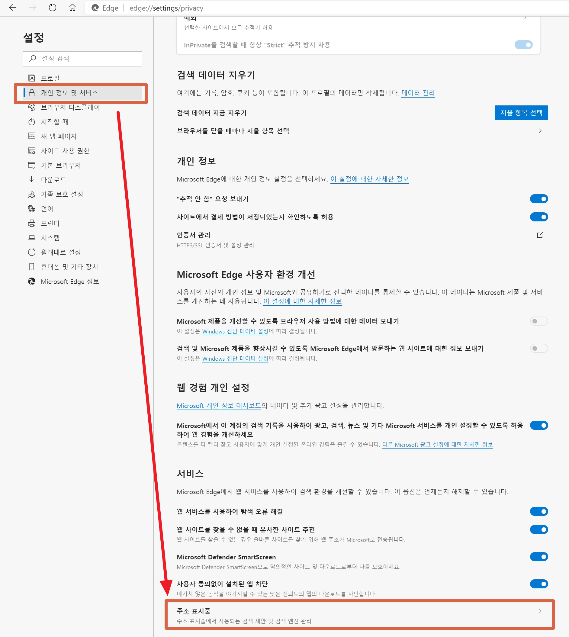 "주소표시줄" 설정으로 가야 한다..