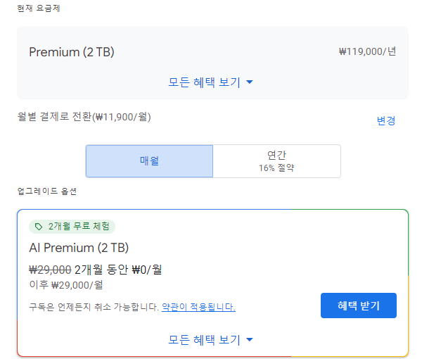 현재 요금제는 2TB 기준 1년 119,000원 입니다.