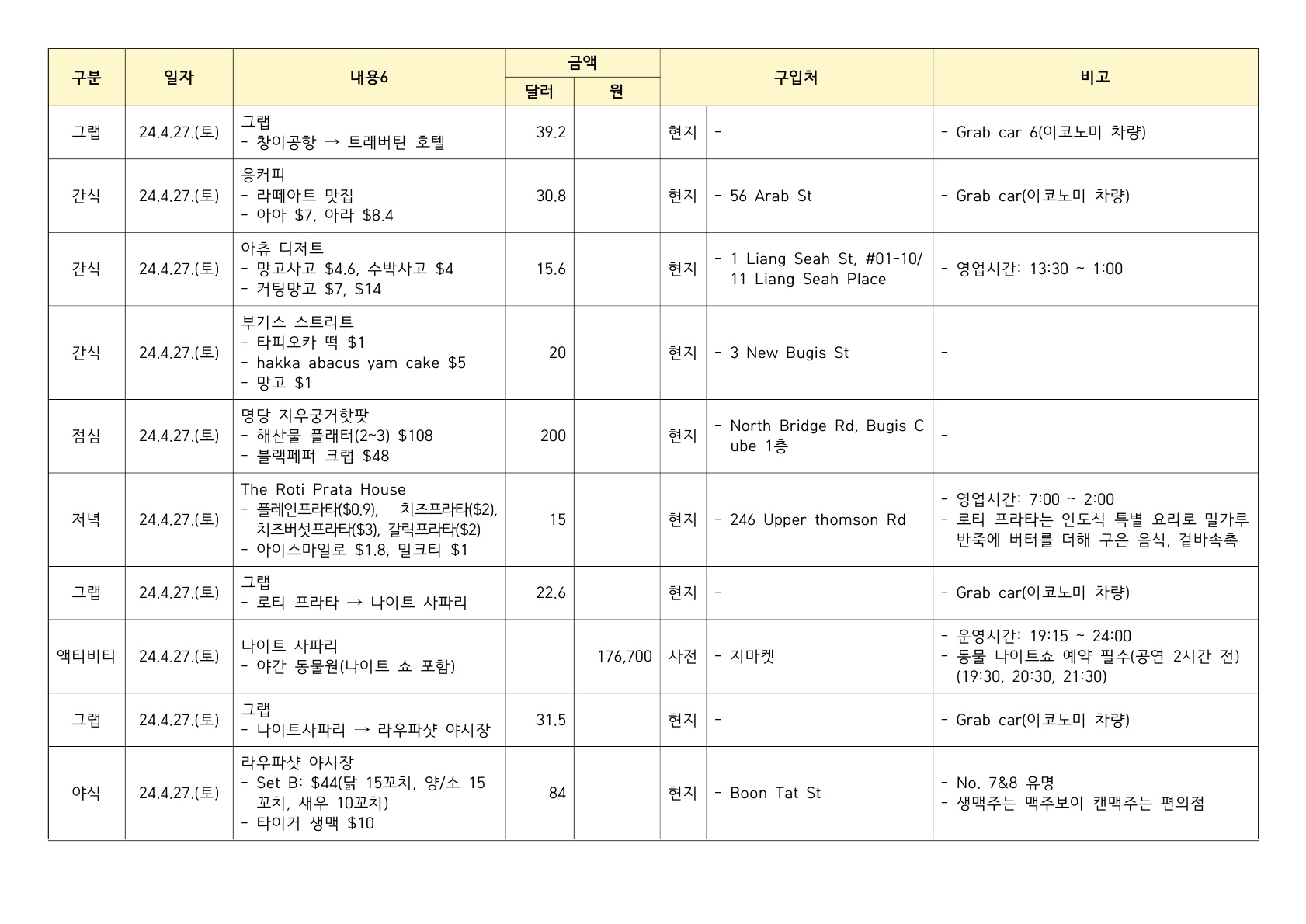 마지막 일정인 그랩타고 나이트사파리🦁🐯 궁금해서 넣은 일정이었는데 기대이상이었다.. (사진 찍으려다 바닥 통나무 발로 차서 왼쪽 새끼발톱이 들렸...) 하마랑 코뿔소를 생전 처음보고.. 하이에나도 실제로 보고.. 정말 평생 보기드문 동물들 보고 옴!!