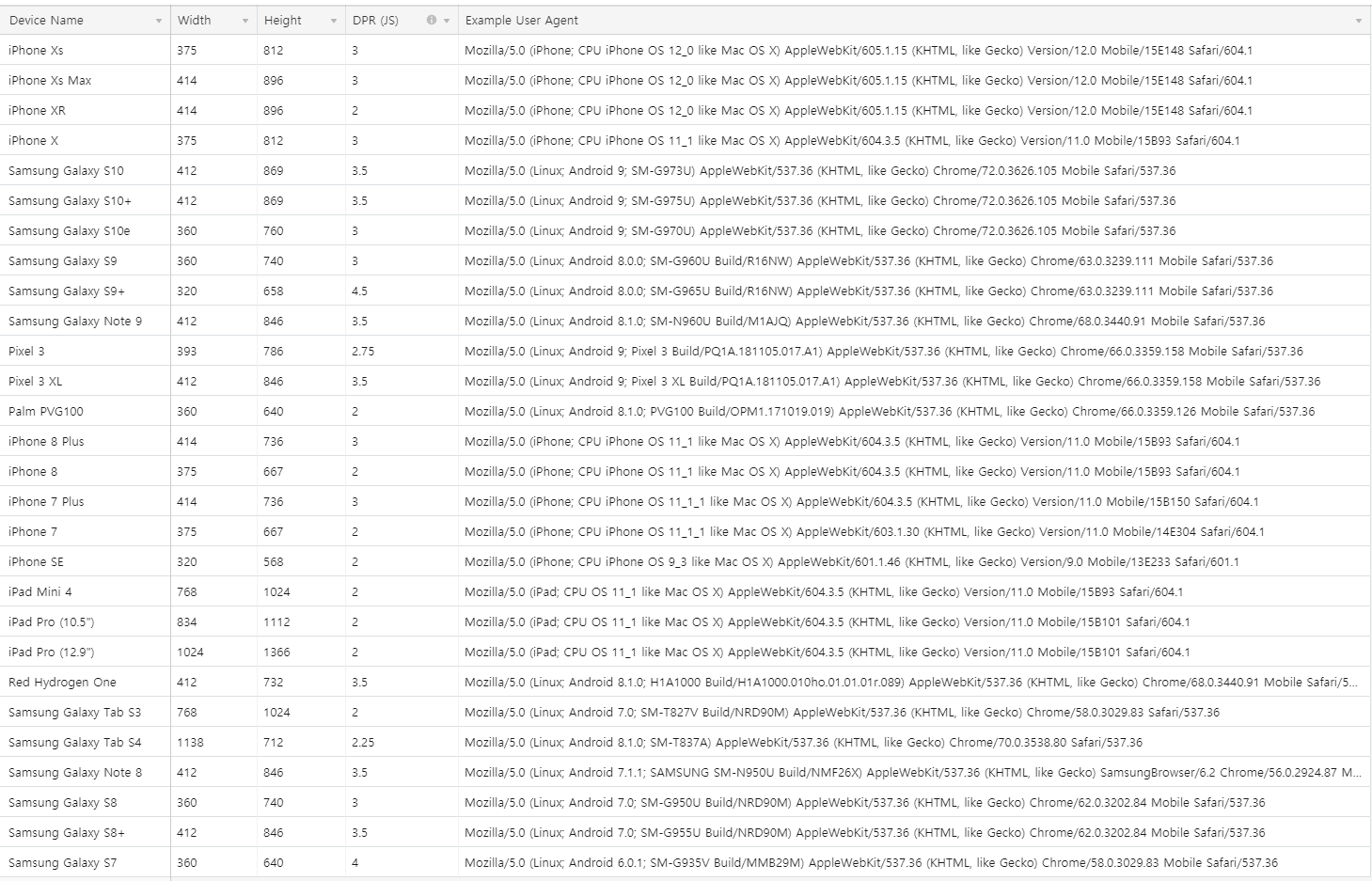 iPhone Xs 375 812 3 Mozilla/5.0 (iPhone; CPU iPhone OS 12_0 like Mac OS X) AppleWebKit/605.1.15 (KHTML, like Gecko) Version/12.0 Mobile/15E148 Safari/604.1